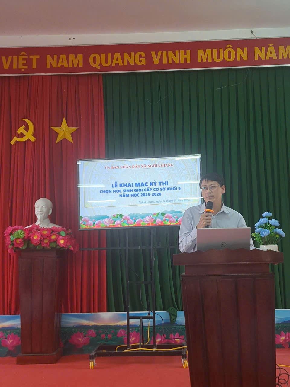 Chiều ngày 31/01/2026, Phòng VH-XH xã Nghĩa Giang đã tổ chức lễ khai mạc Kỳ thi chọn học sinh giỏi cấp cơ sở khối lớp 9 năm học 2025-2026. Lễ khai mạc được tổ chức trang trọng tại điểm thi trường THCS Nghĩa Kỳ (xã Nghĩa Giang) với sự tham dự, chỉ đạo của đồng chí Trương Văn Trung – PCT UBND xã, đồng chí Nguyễn Xuân Vỹ – Trưởng phòng VHXH, thành viên Ban chỉ đạo, giám thị coi thi và 60 thí sinh tham gai kỳ thi từ các trường THCS Nghĩa Thuận, THCS Nghĩa Kỳ, THCS Nghĩa Điền.